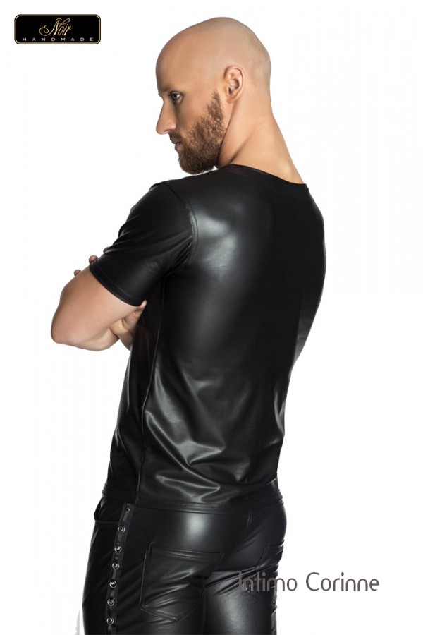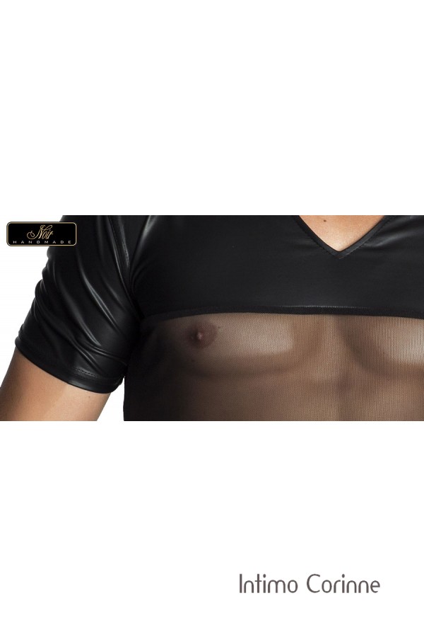 T-Shirt uomo in tessuto effetto bagnato caratterizzata da una fascia trasparente in tulle sul petto.