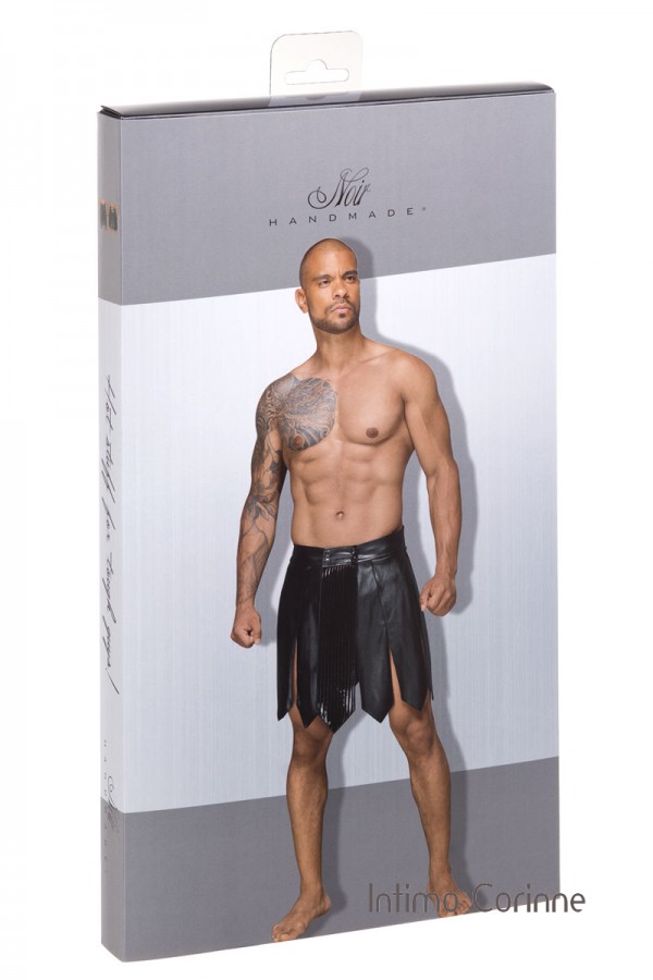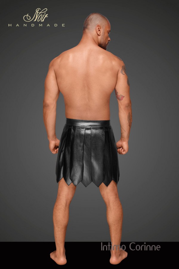 Gonna gladiatore da uomo in ecopelle con fascia anteriore plissettata in PVC. Quest'ultima può essere rimossa in modo tale da poter ottenere due diversi look con un solo capo.