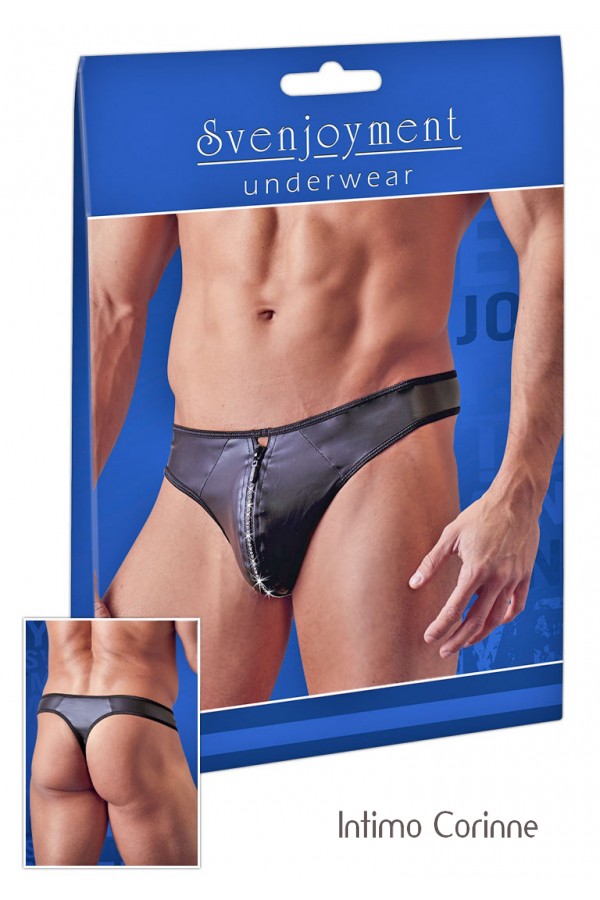 Tanga nero in tessuto opaco elasticizzato, effetto similpelle, caratterizzato da una cerniera lampo frontale impreziosita con numerosi strass sintetici.