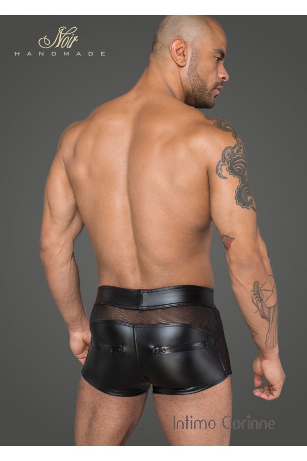 Pantaloncini sexy realizzati in tessuto effetto bagnato (powerwetlook) e rete 3D. La parte anteriore è apribile con zip e ci sono finte cerniere in vinile sul retro.