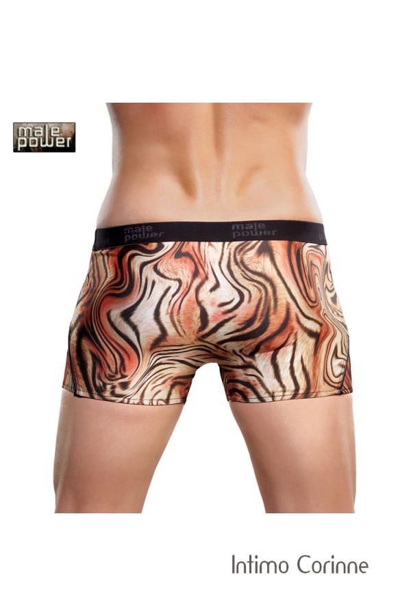 Boxer in fantasia tigrata con inserti laterali semitrasparenti in microretina e doppie cuciture delineate da bordi neri.