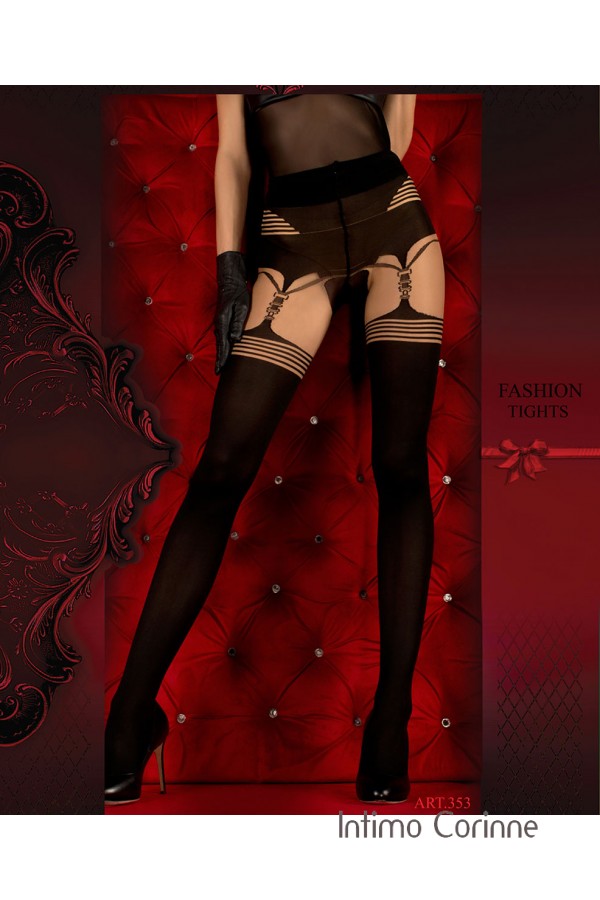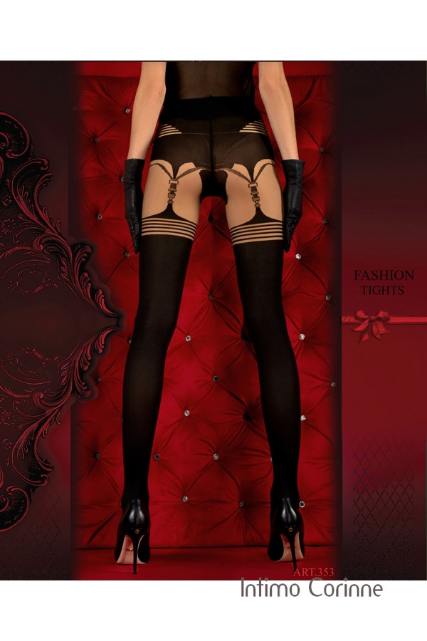 Collant con motivo effetto reggicalze. Filato setificato da 60/20 denari. Tassello in cotone.