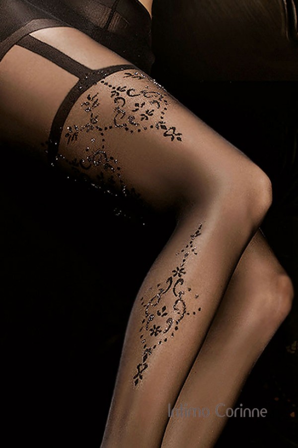 Originali collant velati con disegno reggicalze, impreziositi da ricami sulla gamba e sulla coscia con filamenti argentati in lurex per un meraviglioso effetto brillante. Filato setificato da 20 denari con tassello in cotone.