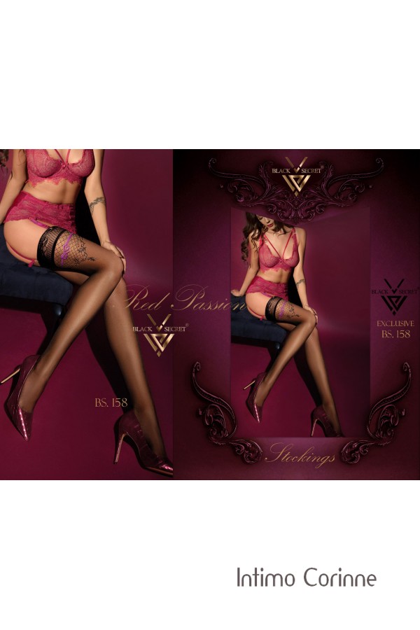 Calze autoreggenti nere velate in lycra caratterizzate nella parte superiore da ricami e laccio con fiocco disegnato color rosa scuro. Realizzate con precisione meticolosa e materiali di alta qualità, assicurano una vestibilità comoda con eleganza e fascino. Balza in pizzo bordeaux siliconata. 20 denari. Punta rinforzata.