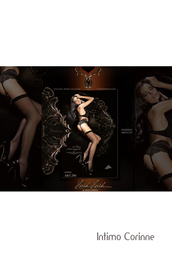 Calze da reggicalze con balza elastica, senza silicone, con ricami rossi sulla coscia e lungo la parte posteriore. Filato setificato da 20 denari color nero con punte rinforzate.