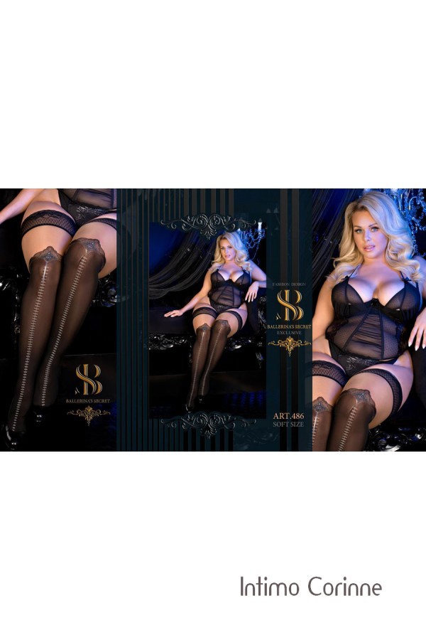 Calze autoreggenti velate in Lycra di colore nero / beige con ricamo sopra il ginocchio e finta cerniera disegnata. Balza siliconata in pizzo. Filato setificato da 20/60 denari. Punte rinforzate.