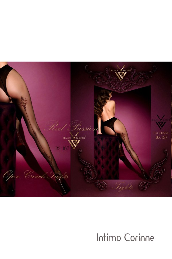 Collant aperto con disegno reggicalze e ricami bordeaux. Art. BS130