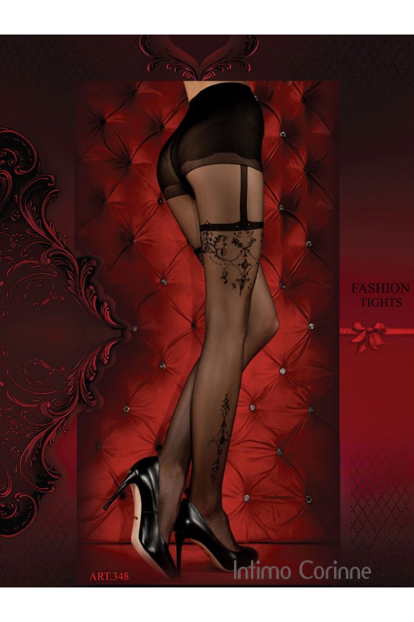 Collant nero in Lycra, effetto reggicalze, con raffinati ricami valorizzati da filo in lurex argentato. Filato setificato da 20 denari. Tassello in cotone.