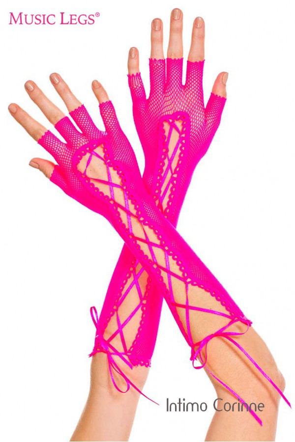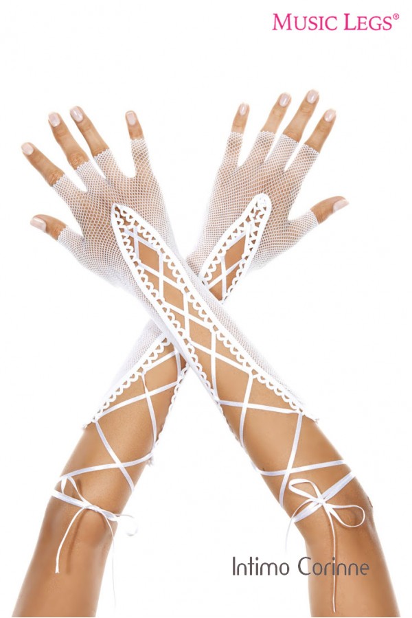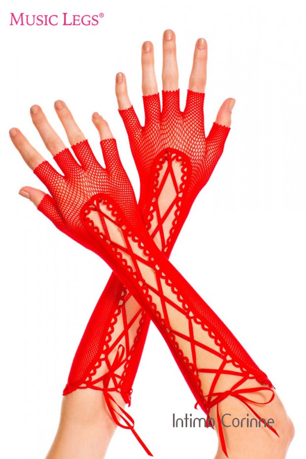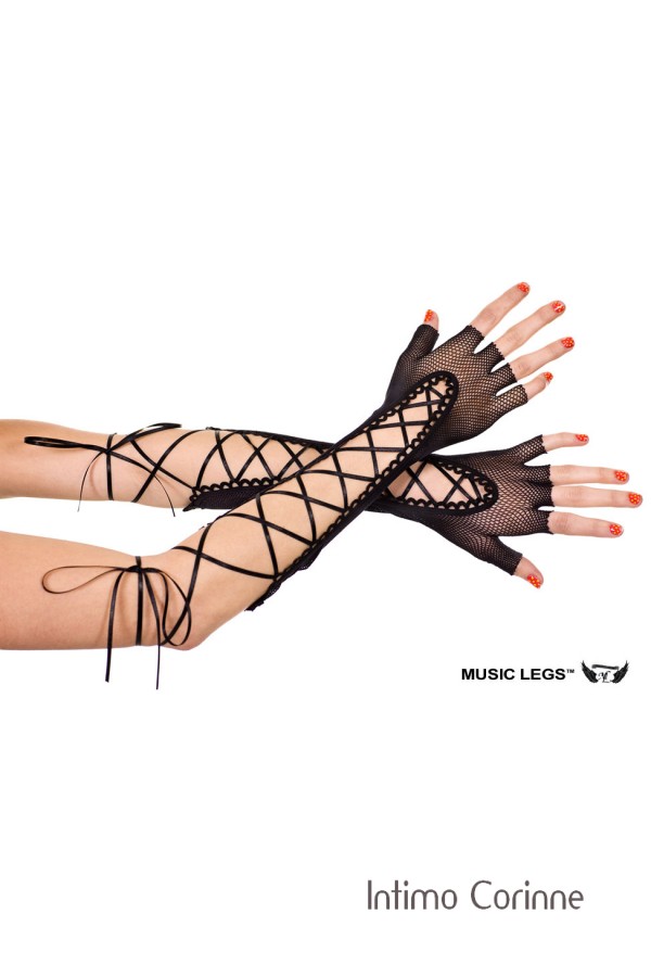 Music leg: guanti lunghi in rete a mezze dita con nastrini.