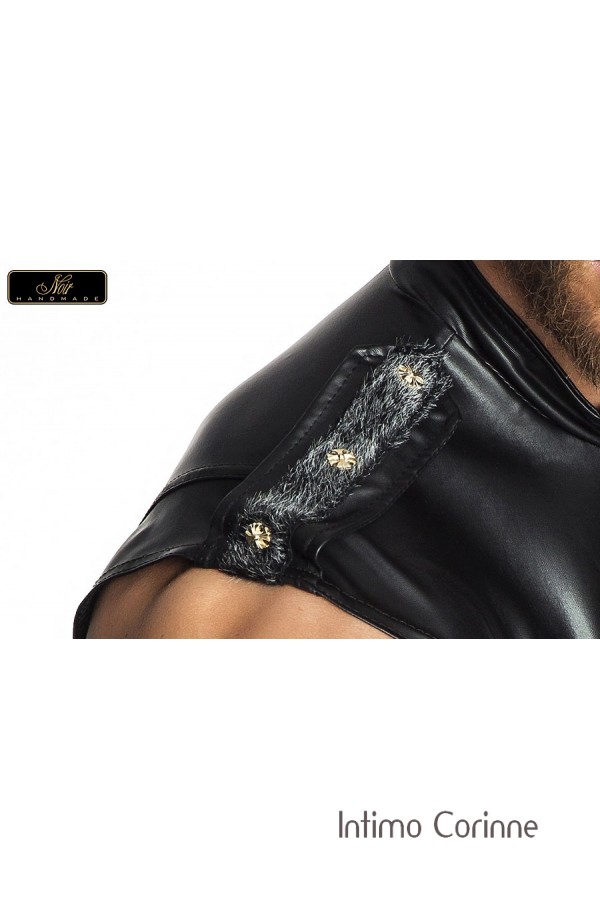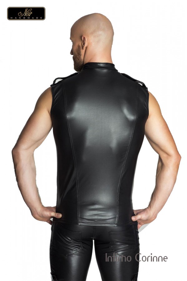Smanicato dal look militare in ottimo tessuto effetto similpelle con fibbie anteriori in pvc ed applicazioni sulle spalle.