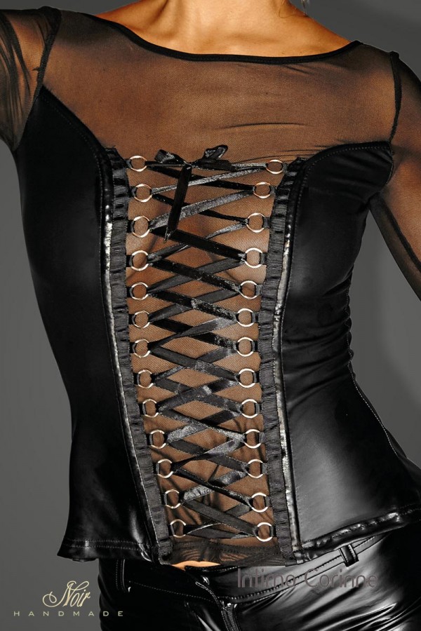 Top a maniche lunghe in morbido tulle e tessuto semi lucido elasticizzato con graziosa stringatura frontale regolabile tramite nastri in raso. Munito di stecchette di sostegno e zip laterale nascosta.