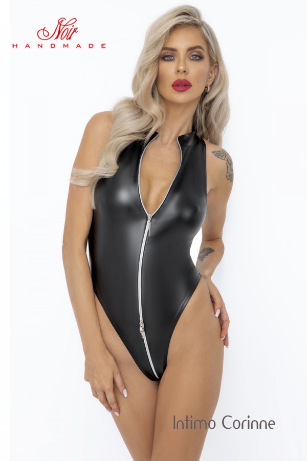 Boby in tessuto Powerwetlook effetto bagnato con lunga cerniera argentata a 3 vie frontale che si estende fino al cavallo. Taglio particolarmente sgambato per evidenziare la formosità del fondoschiena.