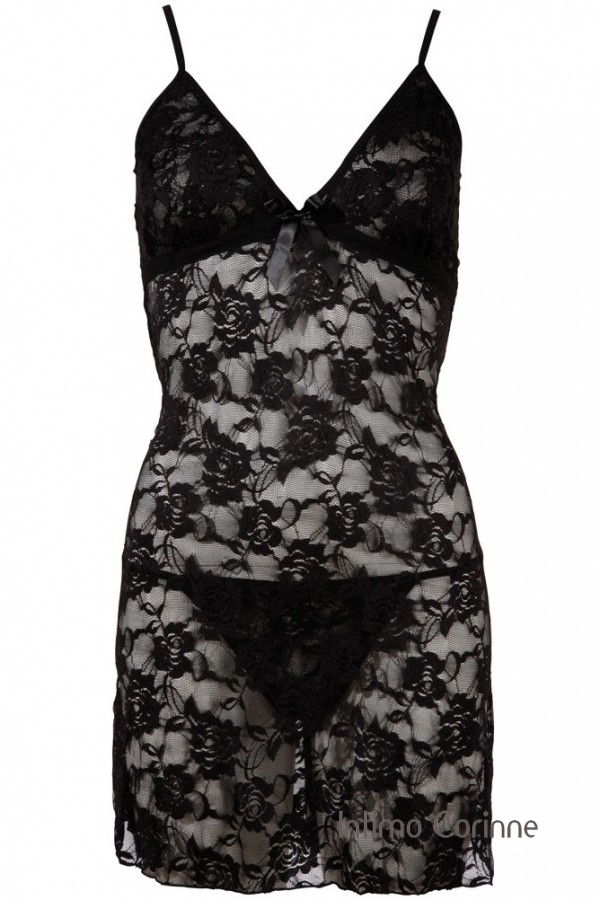 Negligè completamente in fine pizzo elasticizzato a motivi floreali con nastrino sottoseno e fiocco al centro delle coppe, spalline regolabili. Incluso perizoma.