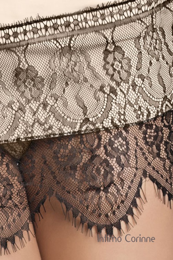 Elegante chemise color sabbia in morbida microfibra arricchita con inserti in pizzo nero dal design raffinato e un pò retrò che si integrano perfettamente col fiocco in tulle posto al centro del decoltè. Spalline regolabili e perizoma in coordinato incluso.