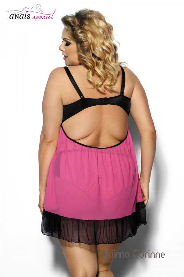 Sensuale babydoll in morbido tulle rosa con inserti in tessuto satin nero. Impreziosito da volants sulle coppe e bordo inferiore arricciato. Slip in coordinato incluso.