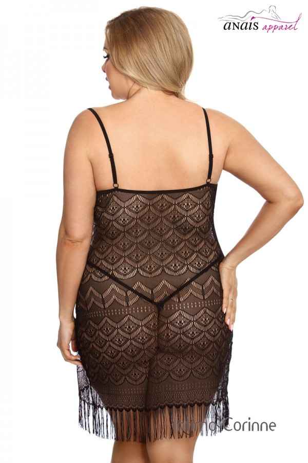 Graziosa chemise aderente in morbido pizzo elasticizzato, interamente ricamata caratterizzata da frange lungo il bordo inferiore. Perizoma incluso.