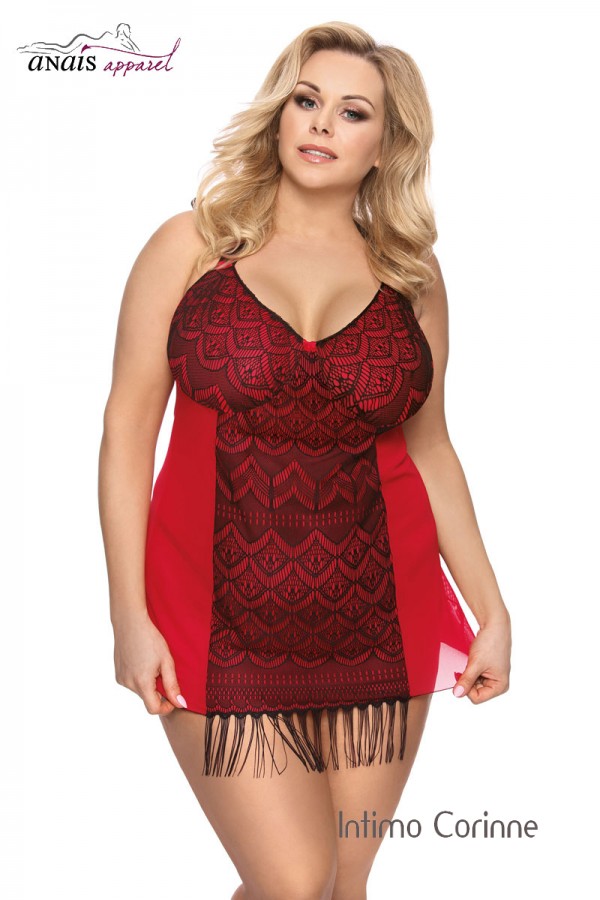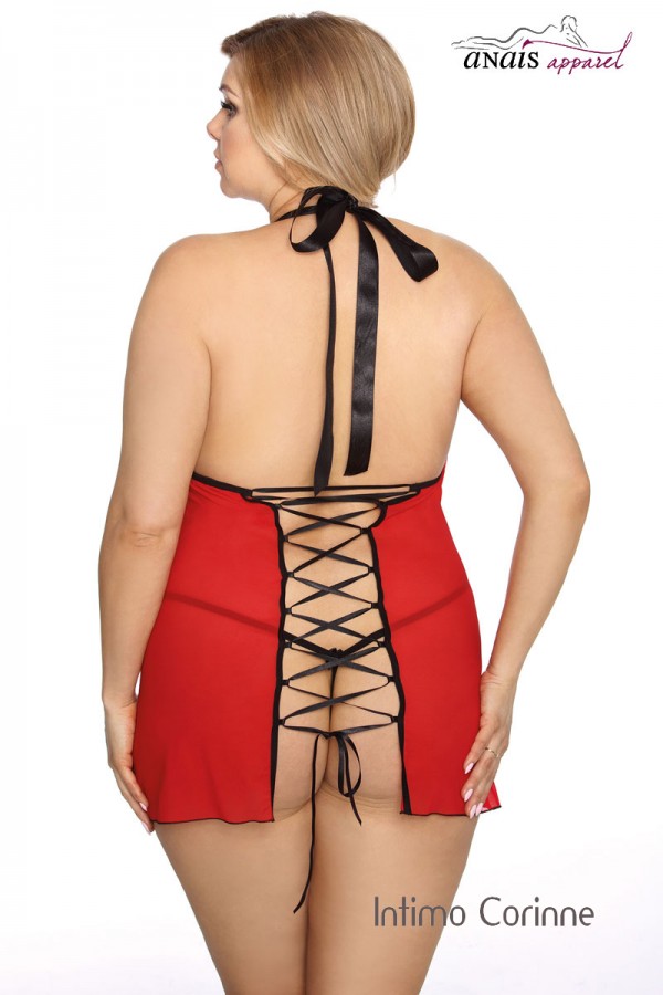Chemise in morbido tulle rosso elasticizzato caratterizzata da sontuosi ricami neri applicati sulle coppe (morbide senza ferretto) e nella zona anteriore. Schiena scoperta con legatura al collo mediante nastri neri in satin ed ampia stringatura sottostante completamente regolabile. Include perizoma coordinato.