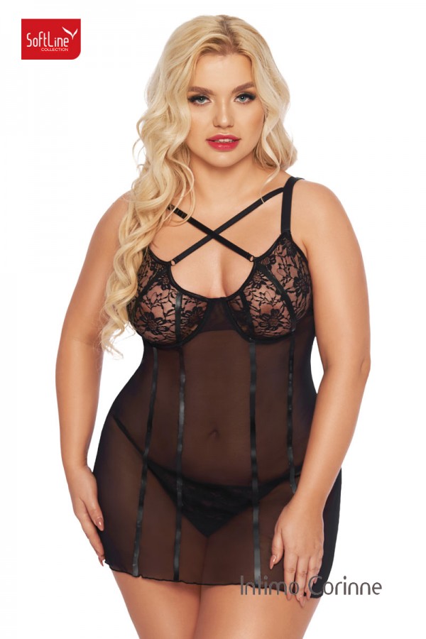 Chemise nera in morbido tulle elasticizzato con pizzo floreale sulle coppe munite di ferretto, rifiniture verticali in tessuto lucido e stringhe elastiche incrociate sul decolletè. Comode spalline larghe e chiusura posteriore regolabile con piccola apertura sottostante. Include perizoma in pizzo.