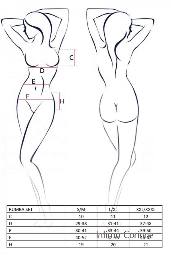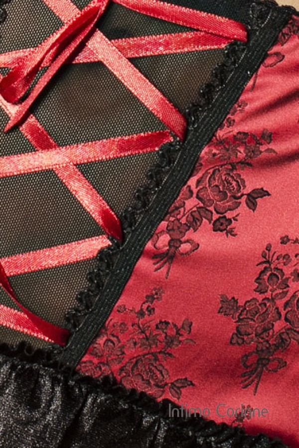 Sensuale completo tre pezzi in morbido raso nero con inserti rossi ricamati. Comprende reggiseno carioca munito di ferreto con bordo superiore arricciato e fiocchetto rosso al centro abbinato ad un'ampia fascia reggicalze dotata di 4 gancetti regolabili con criss cross frontale in raso rosso e balza arricciata lungo il bordo inferiore. Comprende perizoma in coordinato.