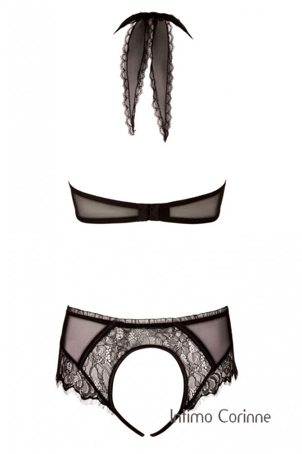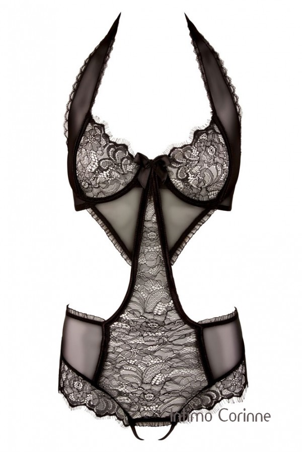 Body realizzato in pizzo floreale cigliato ed inserti in microrete con schiena e zone laterali scoperte. Coppe munite di ferretto con legatura al collo e chiusura posteriore regolabile. La parte inferiore è aperta al cavallo e sui glutei. Comprende guanti in pizzo elasticizzato. Nero.