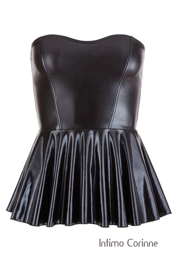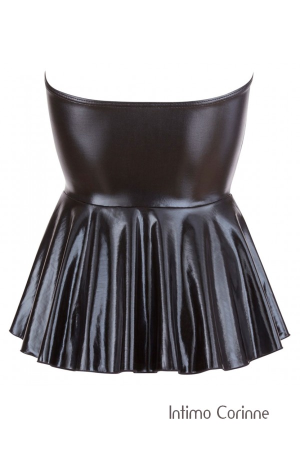 Sensuale top nero senza spalline in tessuto semilucido, effetto bagnato con parte inferiore svasata.