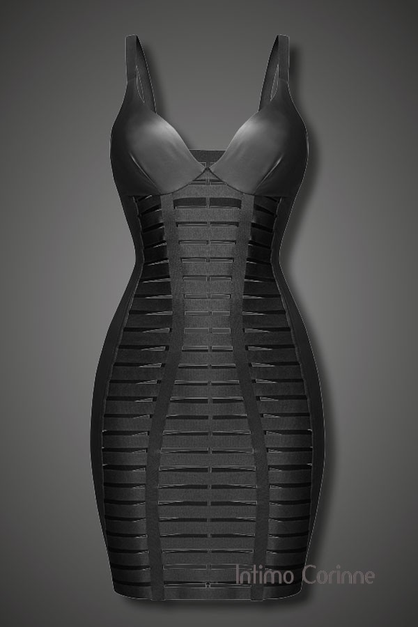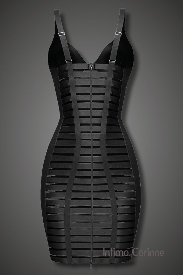 Vestito realizzato in tessuto lucido effetto bagnato sulle coppe e lateralmente mentre davanti e dietro sono disposte numerose strisce elastiche affiancate. E' dotato di palline regolabili e cerniera posteriore per tutta la lunghezza che rende comodo indossarlo. Un capo esclusivo di alta qualità della collezione Noir Handmade prodotto in Europa. Ottenibile anche in numerose taglie comode.