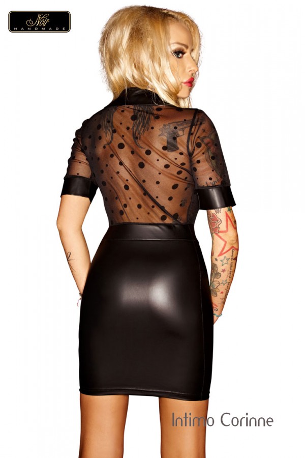 Fantastico vestito realizzato con tessuto lucido elasticizzato effetto bagnato e morbido tulle elasticizzato e trasparente disegnato a pois di diversa grandezza. Un capo esclusivo della collezione Noir Handmade prodotto in Europa.
