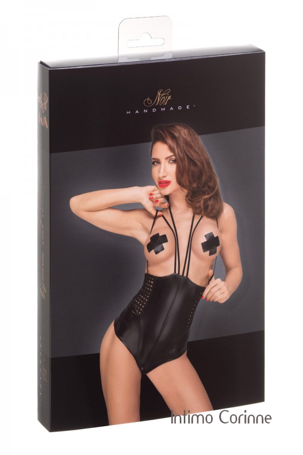 Body in tessuto nero opaco leggermente elasticizzato con inserti decorativi a scacchi sui fianchi costituiti da nastri in velluto elastico (larghi 7 mm). Cinghia di sostegno fissata al collo, cerniera sulla schiena e comoda zip a 2 vie in corrispondenza del cavallo per il vostro comfort.