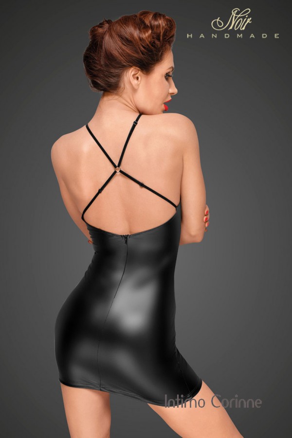 Favoloso mini abito in tessuto nero opaco elasticizzato con ampi inserti in tulle sulle coppe e sontuosi ricami in pizzo sottostanti. Le sottili spalline regolabili sono in velluto elastico ed incrociate sulla schiena con un piccolo anello di giunzione.