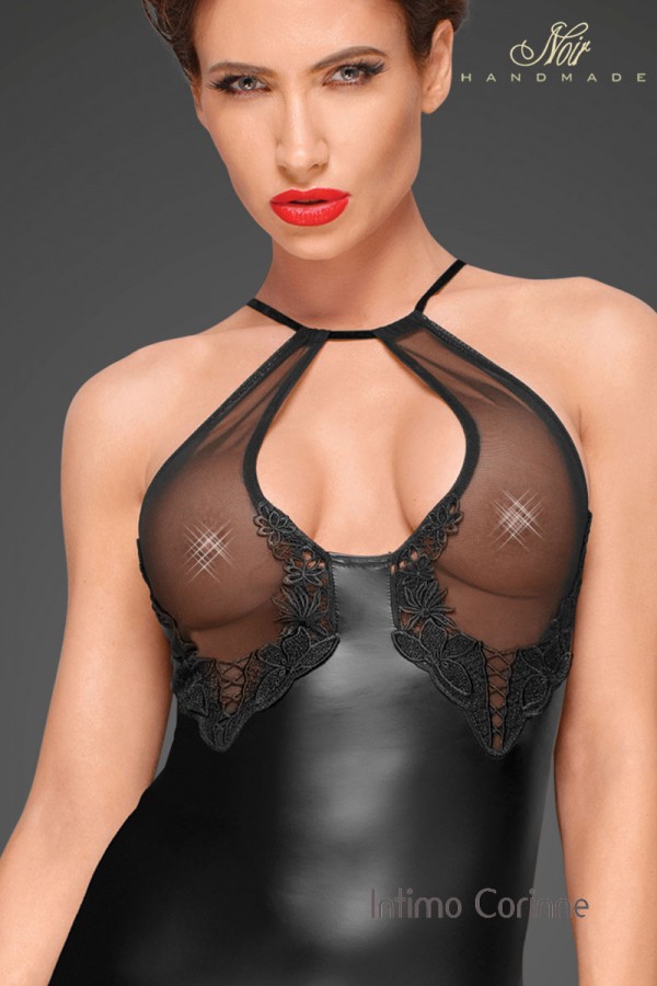 Body donna in tessuto effetto bagnato con inserti in tulle