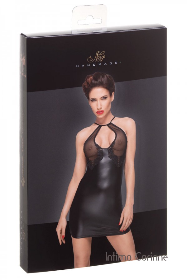 Mini abito nero con coppe in tulle e ricami in pizzo.