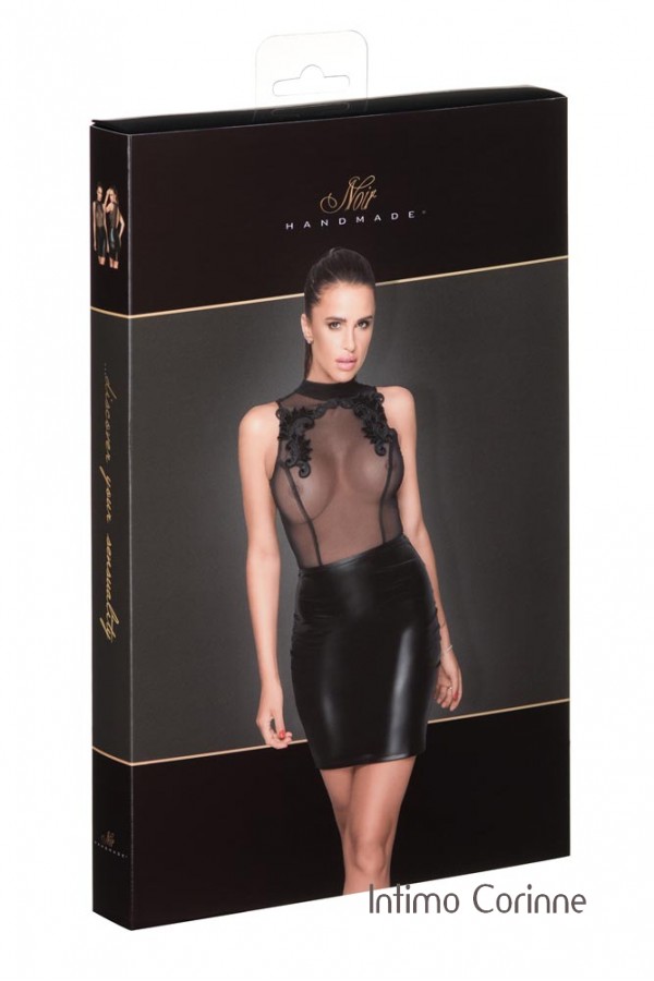 Abito senza maniche con eleganti ricami e cuciture verticali decorative. La parte superiore è realizzata in morbido tulle e presenta un grazioso scollo dietro, che si chiude con due bottoncini. La parte della gonna è realizzata in eccezionale tessuto effetto bagnato elastico e ha un piccolo spacco posteriore.