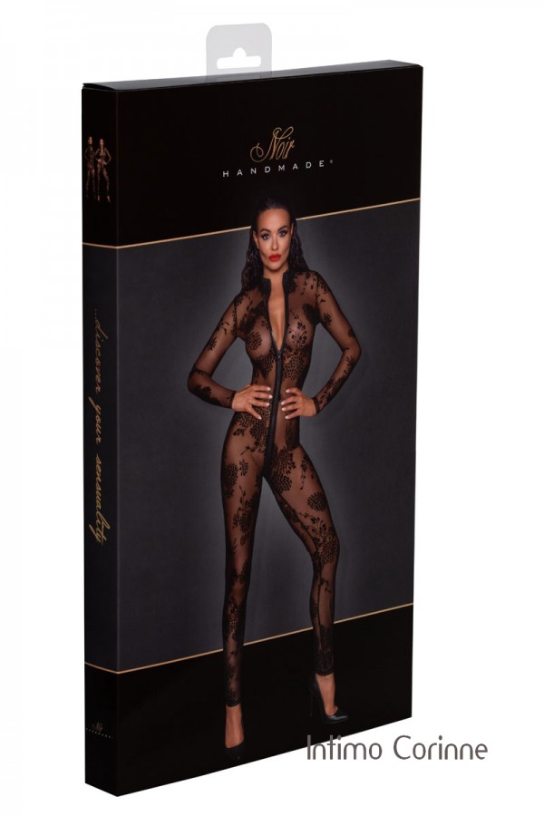 Sexy tuta in morbido tulle nero decorata con ricami floreali floccati. Dispone di una lunga cerniera a 3 vie che parte dal colletto fino al cavallo. Questo look trasparente ed accattivante mette in mostra la femminilità con stile e sensualità.