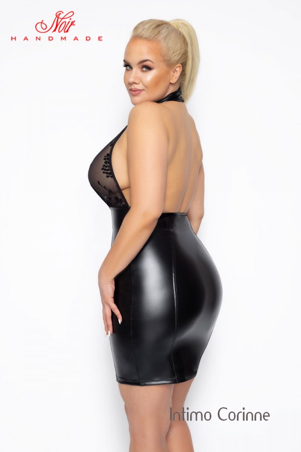 Mini abito con top in tulle trasparente e minigonna in Powerwetlook. Lascia la schiena nuda e ha un'ampia scollatura anteriore. Apertura anteriore attraverso una cerniera bidirezionale sulla minigonna che permette di indossarlo comodamente e una facile rimozione.
