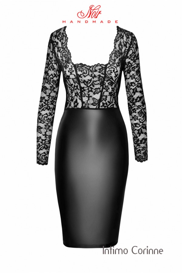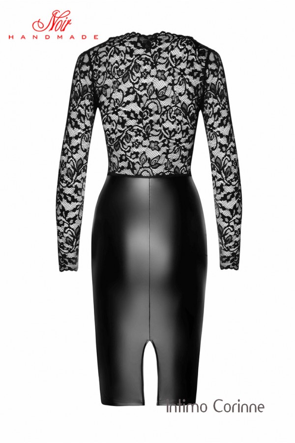Sensuale vestito midi a tubino con gonna in tessuto Powerwetlook e top in pizzo floreale a maniche lunghe con generosa scollatura quadrata. Piccolo spacco posteriore nella gonna.