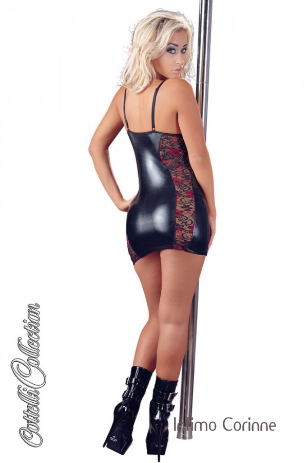 Mini abito aderente, realizzato in tessuto lucido effetto bagnato, combinato con delicato pizzo in due diversi colori nero e rosso. Bretelline regolabili.
