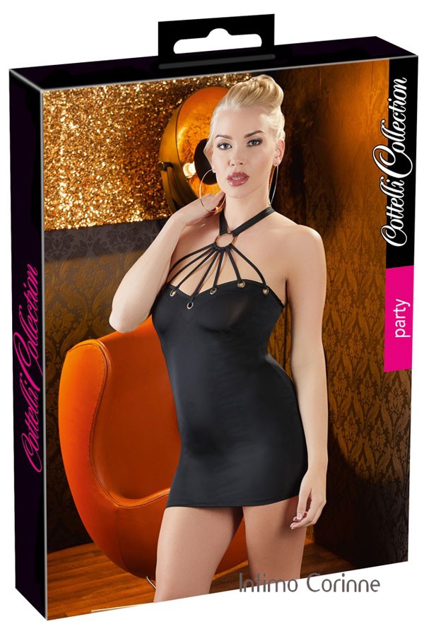 Mini abito nero aderente con anello ed occhielli decorativi color ottone collegati tramite 7 fettucce creando un grazioso motivo stringato sul décolleté. Comode spalline larghe e regolabili incrociate sulla schiena. Tessuto di alta qualità, elasticizzato e setoso al tatto.