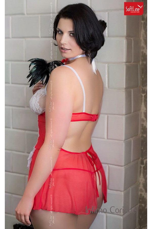 Grazioso set cameriera 3 pezzi composto da una morbida chemise in tulle e pizzo con chiusure posteriori regolabili tramite gancetti e legatura sul girovita. Comprende collarino con fiocchetto e perizoma abbinato. Colore rosso/bianco.