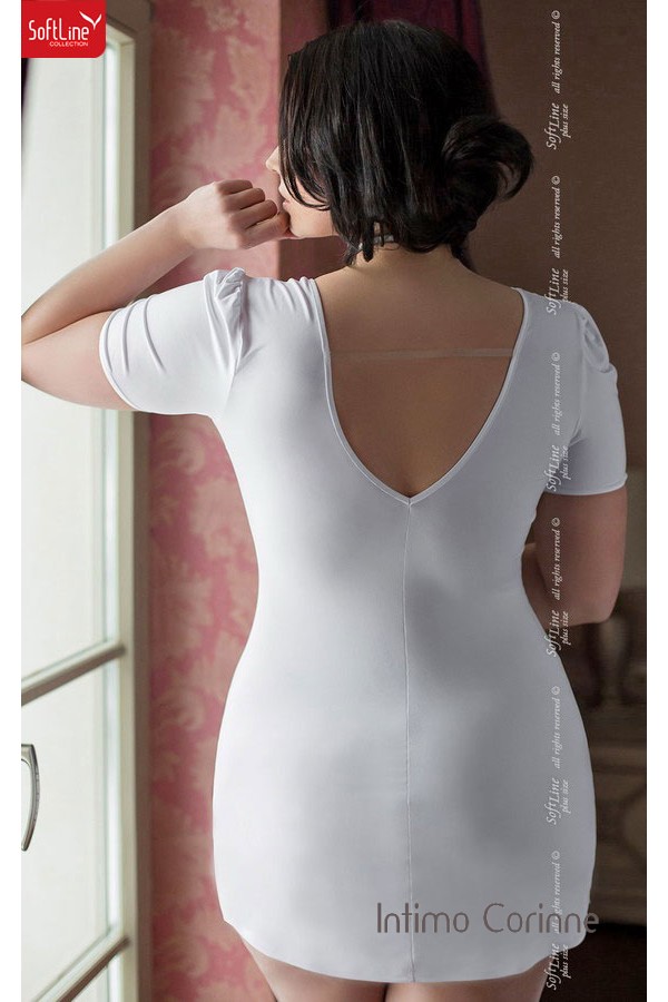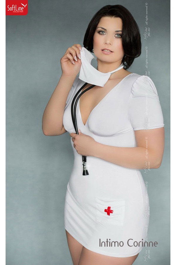 Mini abito bianco da infermiera a mezze maniche con croce rossa cucita sulla tasca anteriore e mascherina per il viso. Profonde scollature a V anteriore e posteriore che sottolineano il seno e la schiena. Abito realizzato in tessuto elasticizzato, molto confortevole. Escluso stetoscopio.