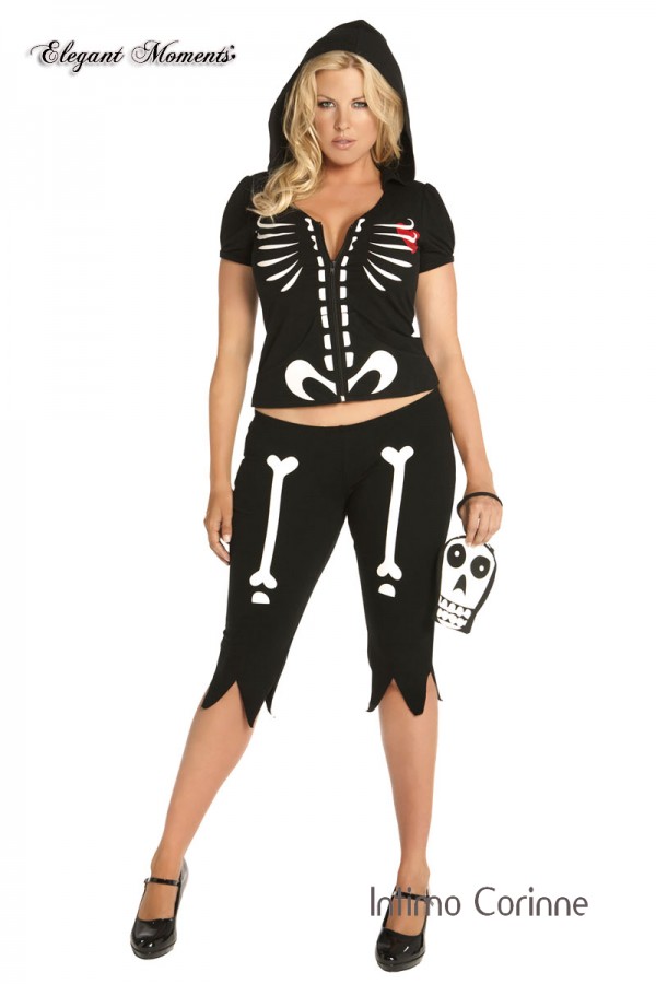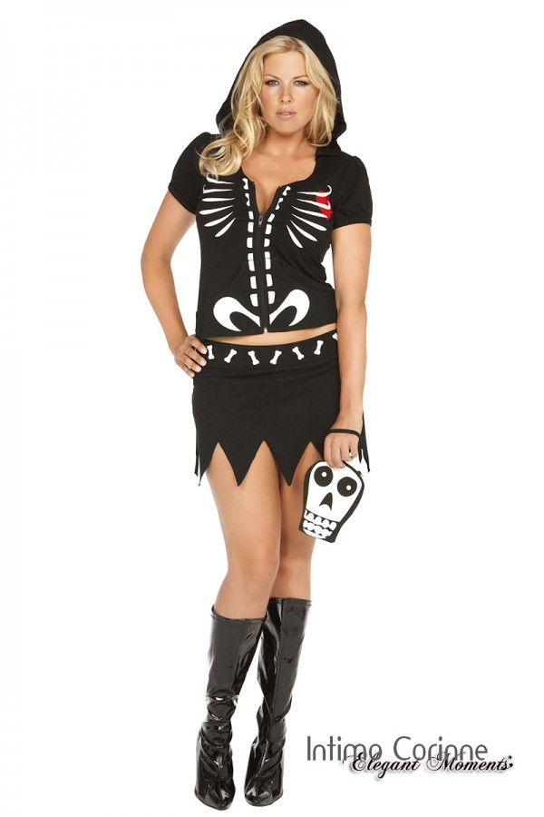 Simpatico costume da scheletro di colore nero con ossa disegnate bianche. Comprende minigonnellino con bordi frastagliati e zip, pinocchietti elasticizzati, borsetta con disegno teschio, felpa leggera con cappuccio e cerniera anteriore.