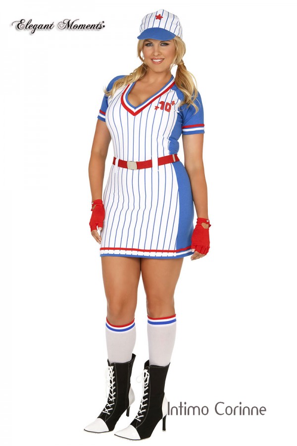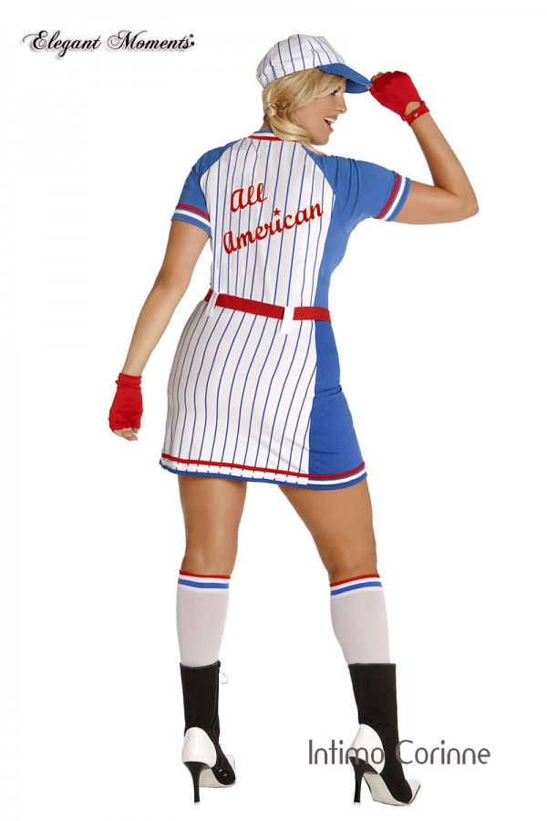 Travestimento giocatrice di baseball 5 pezzi. Comprende miniabito a righe blu-bianco con scritte e rifiniture rosse, berretto, calze, cintura rossa e guanti corti a dita libere.