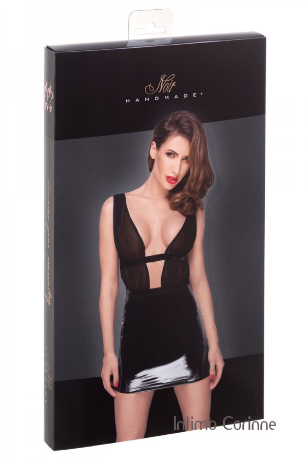 Mini abito caratterizzato dalla parte inferiore in PVC e la parte superiore in chiffon con bordi e fascia giro-busto in morbido velluto elastico. Chiusura posteriore regolabile tramite gancetti. La parte inferiore lucida è munita di una cerniera laterale nascosta.