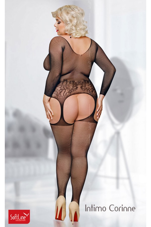 Catsuit con maniche lunghe, effetto reggicalze, con decoro sul basso ventre ed apertura ovale sul decollete.