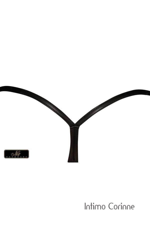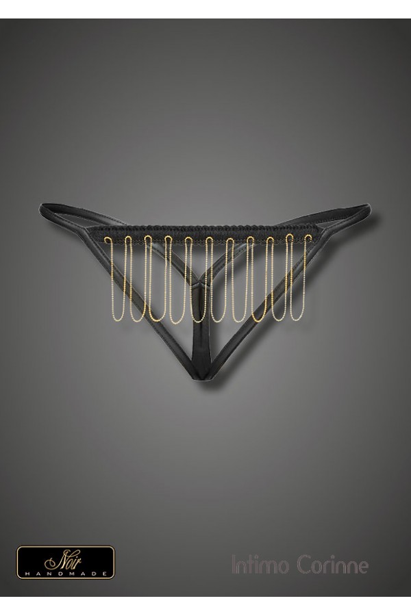 Perizoma totalmente aperto che decora le parti intime solo con un'applicazione di catenelle dorate nella parte anteriore. Il fianchetto e i bordi sono realizzati con tessuto lucido effetto bagnato. Un capo esclusivo di alta qualità della collezione Noir Handmade prodotto in Europa. Ottenibile anche in numerose taglie comode.