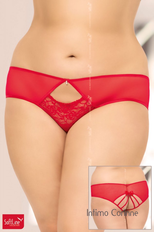 Sensuale slip in morbida microrete rossa con inserto centrale in pizzo floreale ed apertura nella parte anteriore. Posteriormente presenta un apertura stringata con fiocco centrale in satin.
