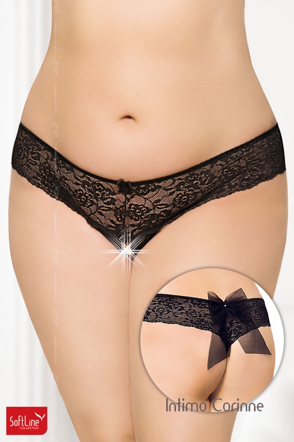 Sensuale brasiliana in morbido pizzo floreale nero completamente aperta al cavallo impreziosita da fiocco posteriore in tulle con strass centrale.