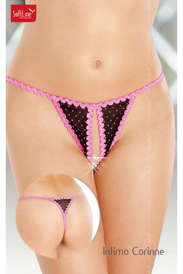 Tanga nero a pois rosa, aperto davanti ed al cavallo, con bordi e fianchetti rosa lavorati.