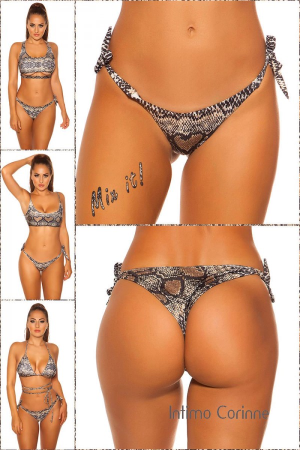 Tanga bikini brasiliano pitonato con lacci laterali.