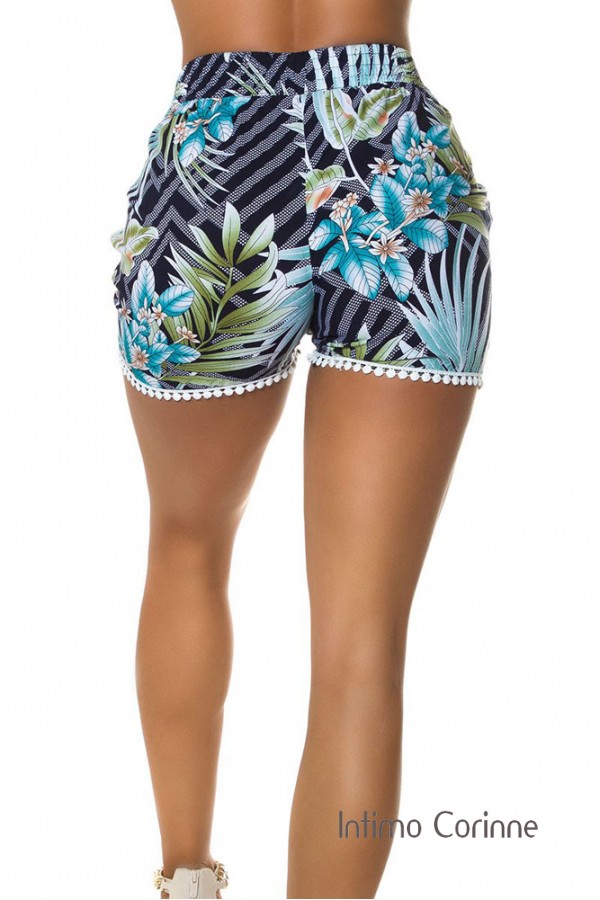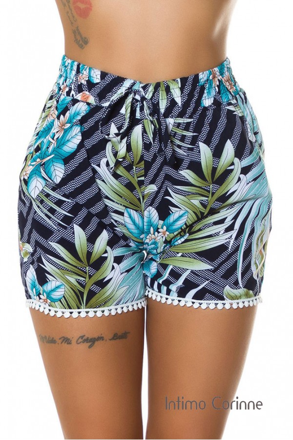 Shorts moderni e giovanili a vita alta con stampa fantasia tropicale.