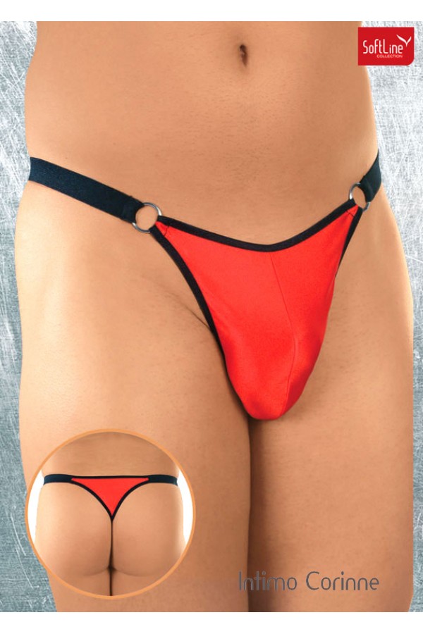 Tanga in morbido tessuto rosso con bordi in contrasto neri impreziosito da anellini argentati laterali.